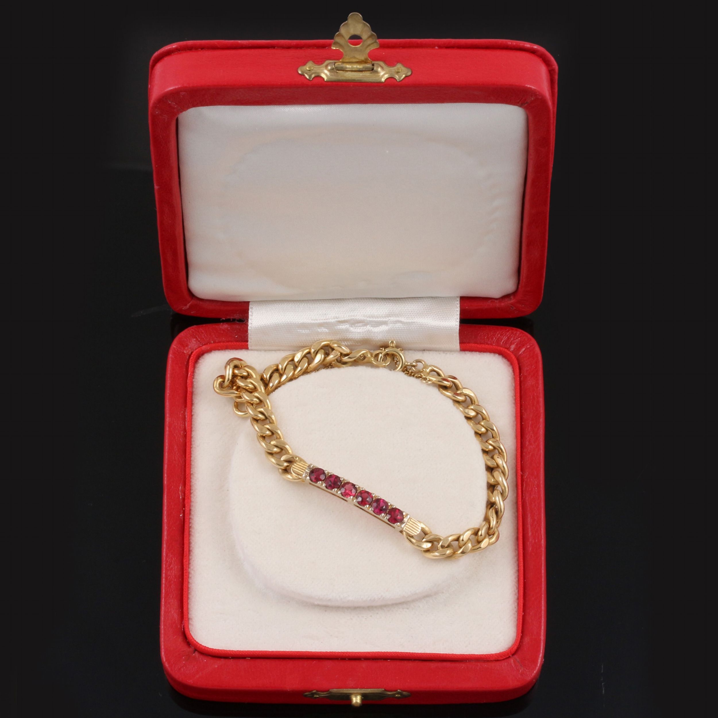 in oro giallo a maglia groumette con rubelliti, gr. 10. Corredato da custodia.