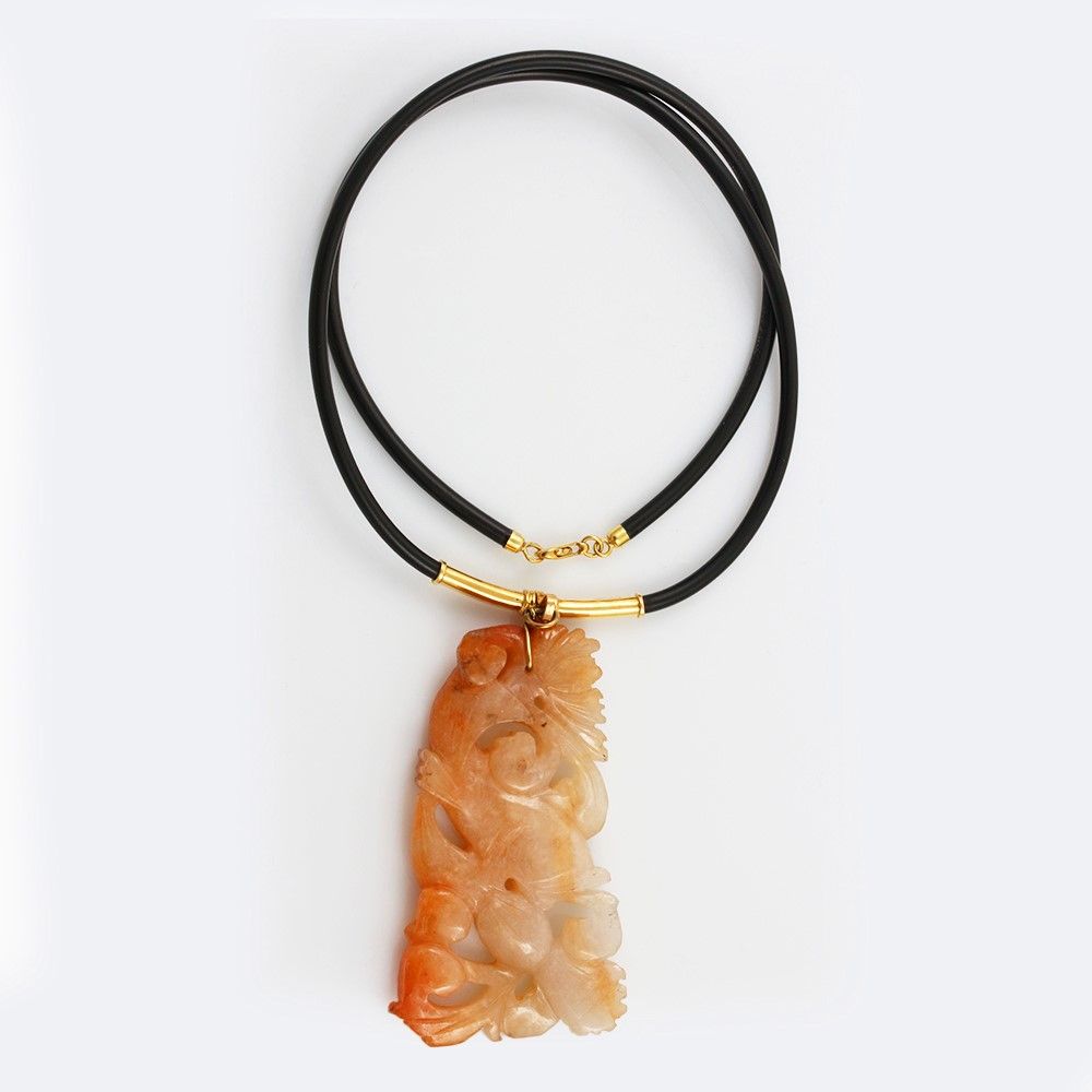 girocollo in caucciù con giadeite incisa a motivi zoomorfi d'ispirazione orientale, montatura in oro giallo.Lunghezza 49 cmDimensioni pendete 7 x 4 cm ca.