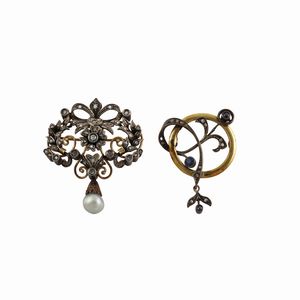 composto da due spille di cui una doppio uso pendente realizzate in oro e argento ornate da diamanti taglio a [..]