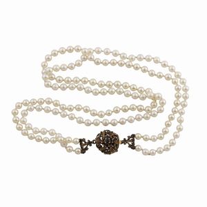 due fili di perle 4,5 / 5 mm con chiusura a rosone in oro giallo, argento e piccoli zaffiri. Lunghezza 45 cm [..]