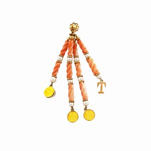 in oro giallo a clip con vite costituito da quattro pendenti in corallo alternati a perline, dischetti in oro [..]