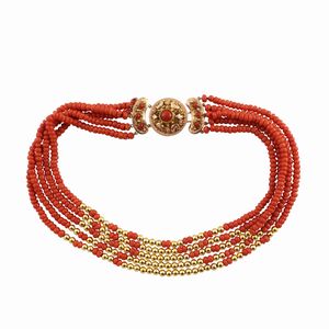 a cinque fili di sfere di corallo alternate anteriormente da sfere in materiale sintetico dorato, chiusura in [..]