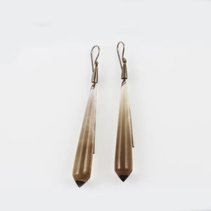 lunghi pendenti in oro brunito ciascuno con quarzo fumé. Lunghezza 8,5 cm ca. Firmati: Loris Abate