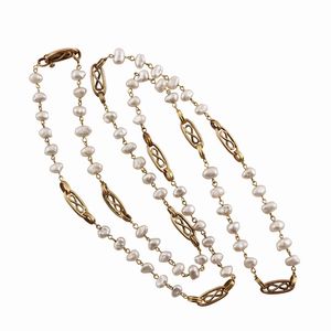 in oro con perle d'acqua dolce alternate a motivi ovali aperti, gr. 28,7. Lunghezza 88 cm