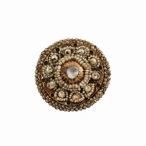a rosone in oro a titolo basso e argento ornata da perline (alcune mancanti) con diamante taglio a rosa posto [..]