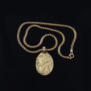 in oro giallo composto da girocollo a maglia tubolare e pendente ovale con figura femminile, gr. complessivi [..]