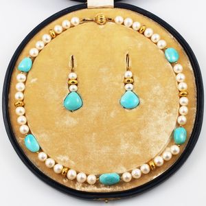 composta da girocollo in oro giallo con perle d'acqua dolce e turchesi, orecchini pendenti en suite. Corredata [..]