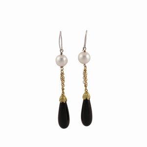 pendenti in oro giallo e bianco con onice e perla. Lunghezza 6,5 cm ca.