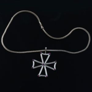 in oro bianco composto da girocollo a maglia piatta e croce di malta pendente ornata da piccoli rubini, gr. complessivi [..]