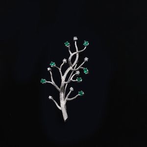 ramage in oro bianco con smeraldi e brillanti, gr. 10,2. Dimensioni 6,2 x 3,3 cm ca.