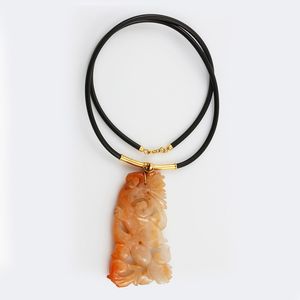 girocollo in caucciù con giadeite incisa a motivi zoomorfi d'ispirazione orientale, montatura in oro giallo. [..]