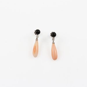 pendenti ciascuno con onice e corallo a goccia inframezzati da un piccolo brillante, gr. 4,8. Lunghezza 3,5 cm [..]