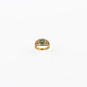 in oro giallo a fascia sagomata con smeraldo centrale e brillanti ad ornamento, gr. 5,6. Misura 16