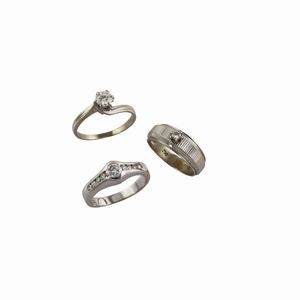 in oro bianco a fogge differenti ciascuno con brillante al centro, gr. complessivi 14,7. Misura 11 e 14