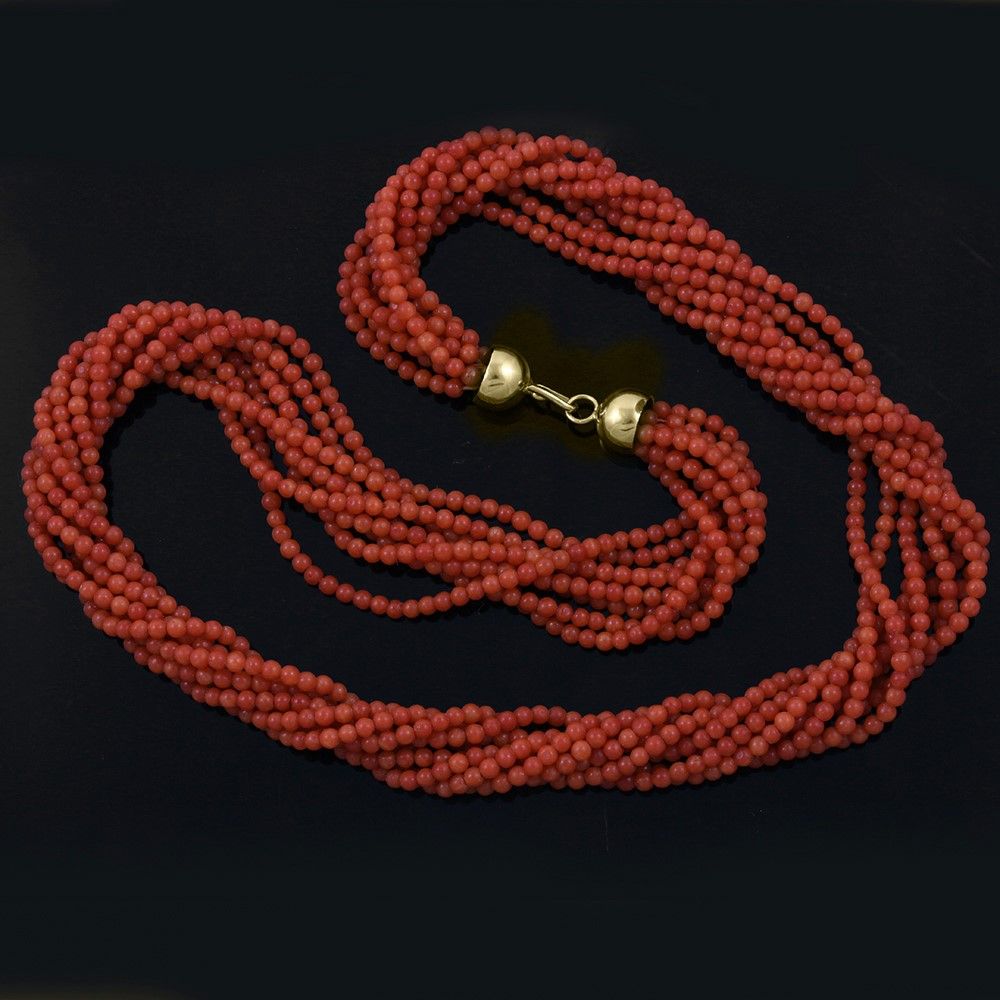 torchon composto da otto fili di sferette di corallo con chiusura in oro giallo, gr. 37,3.Lunghezza 43 cm ca.