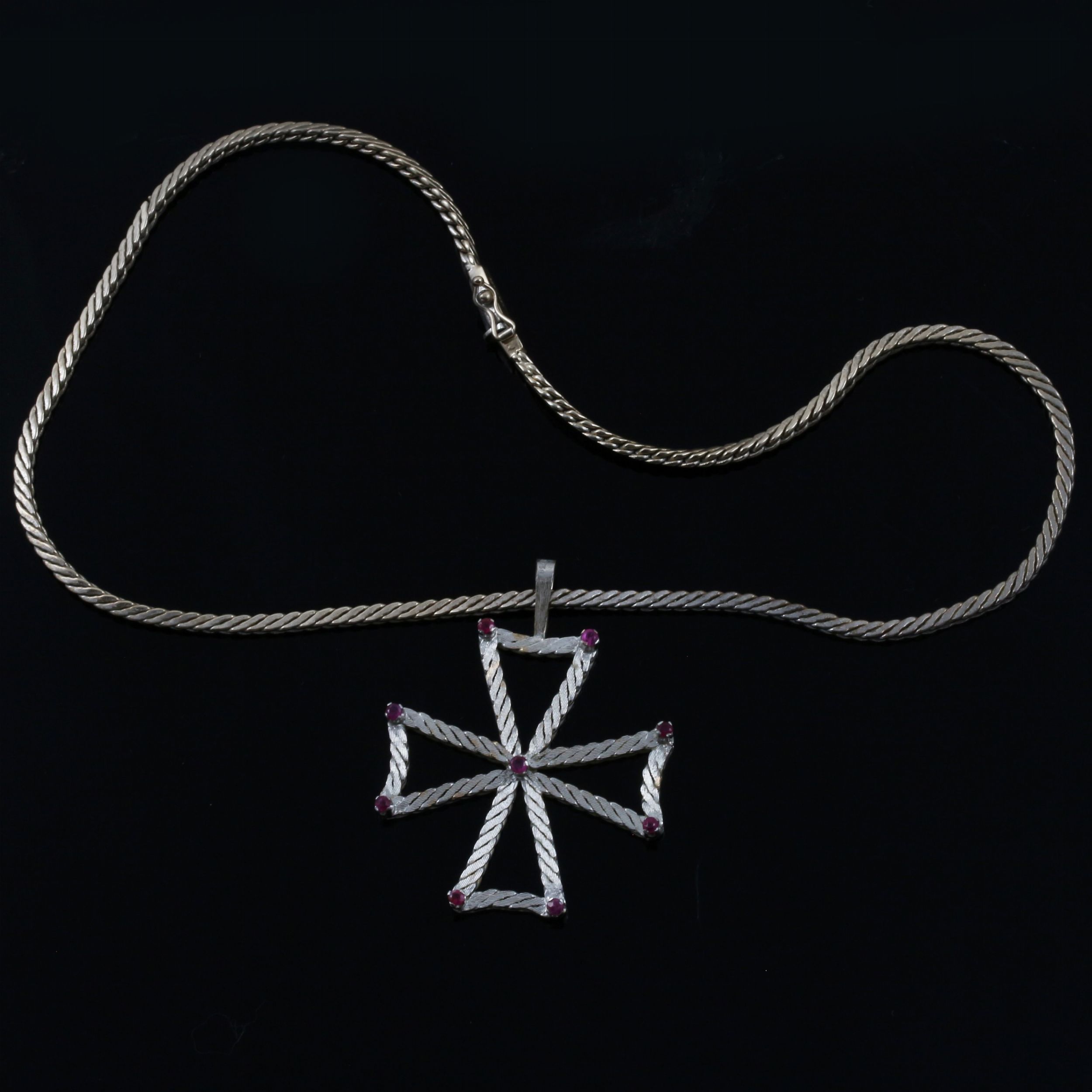 in oro bianco composto da girocollo a maglia piatta e croce di malta pendente ornata da piccoli rubini, gr. complessivi 26,9.Lunghezza 36 cmDimensione pendente 4,7 x 3,5 cm ca.