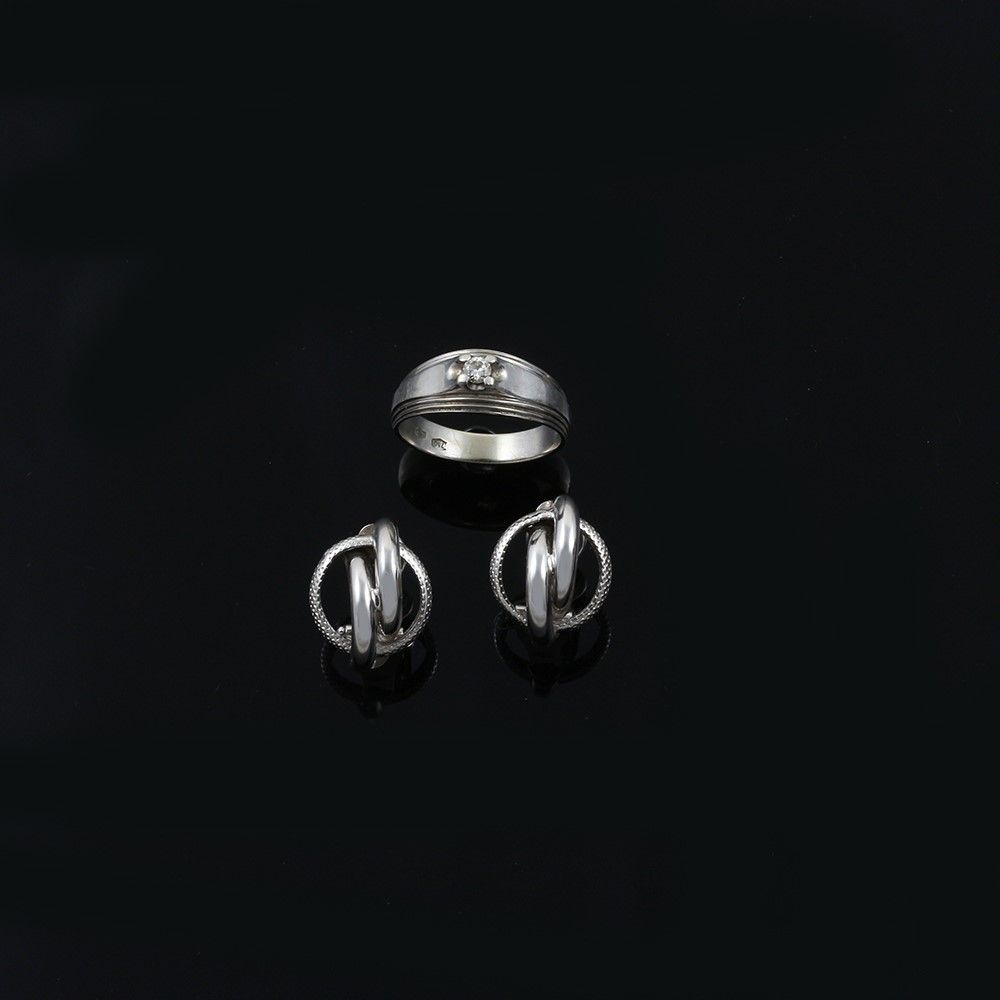 in oro bianco composto da orecchini a clip con perno e anello a fascia con brillante, gr. complessivi 10,5.Misura anello 20,5