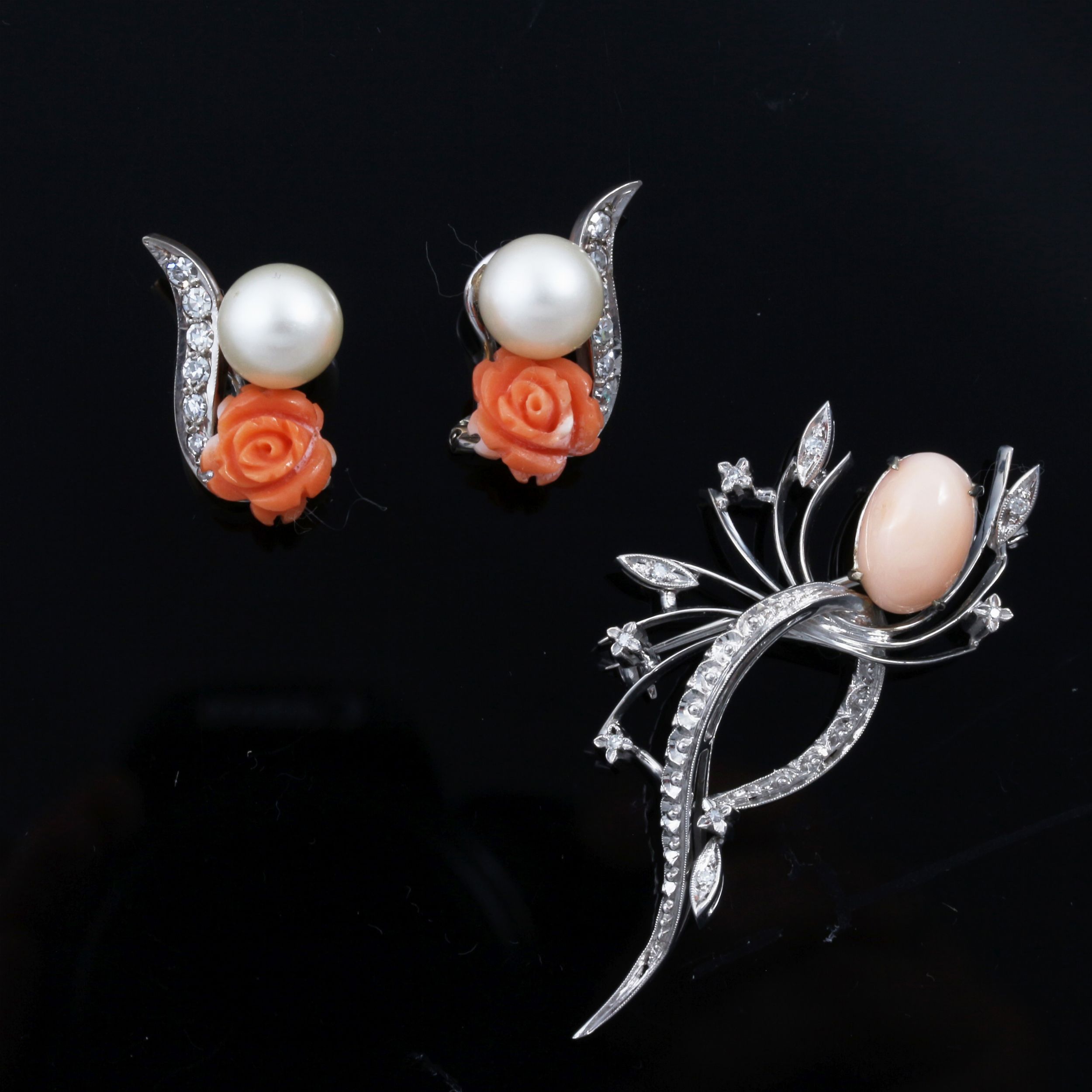 composto da spilla e orecchini in oro con coralli, perle e diamanti, gr. complessivi 18,2.