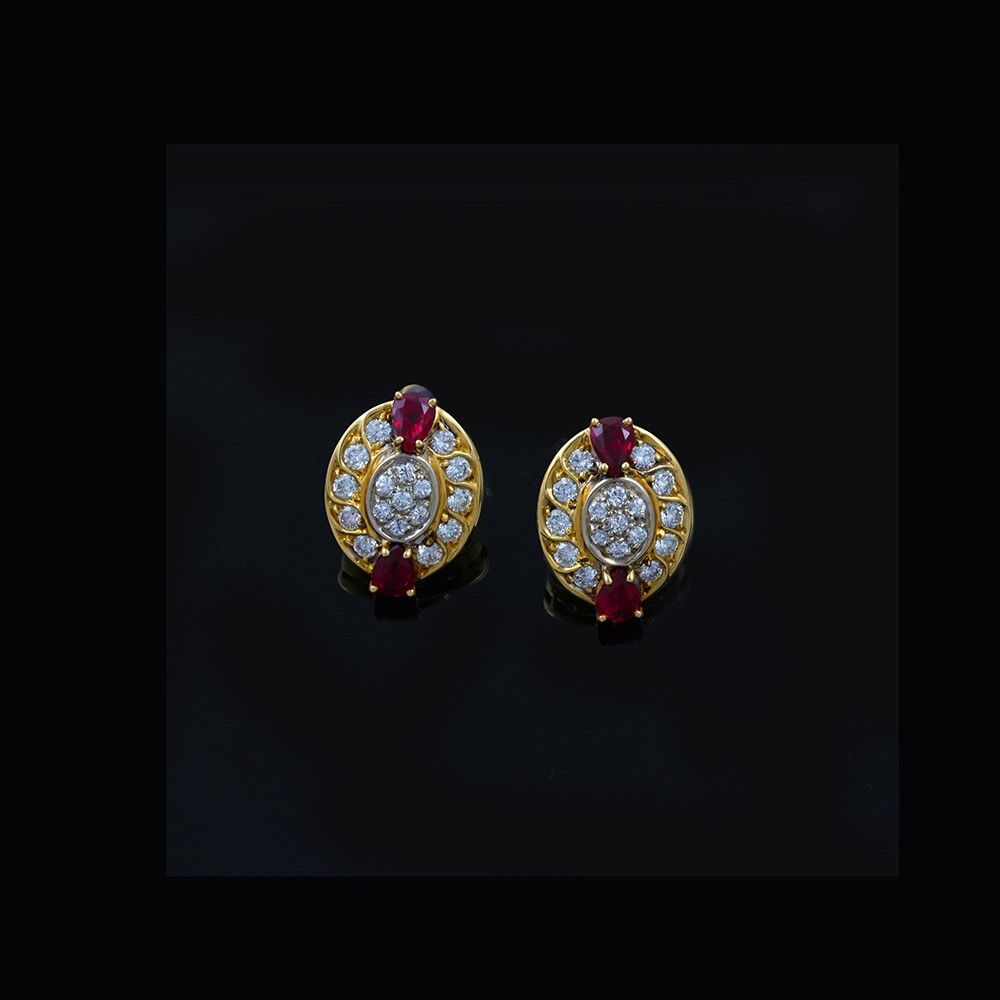 in oro giallo e bianco a forma ovale con brillanti del peso complessivo di 0,70 ct ca. e rubini a goccia, gr. 5,9.Dimensioni 1,7 x 1,3 cm ca.