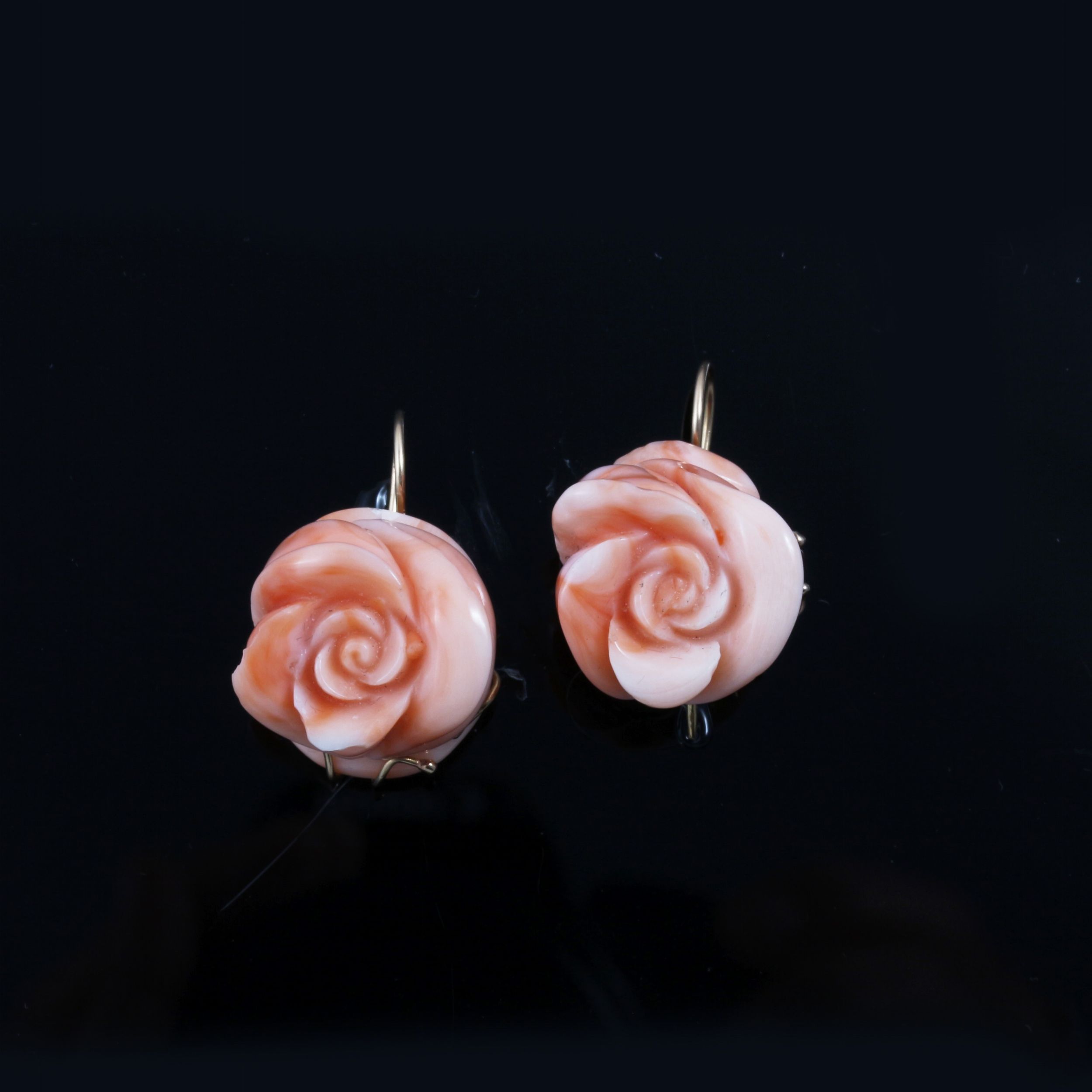 con rose incise di corallo montati in oro a titolo basso, gr. 16,4.