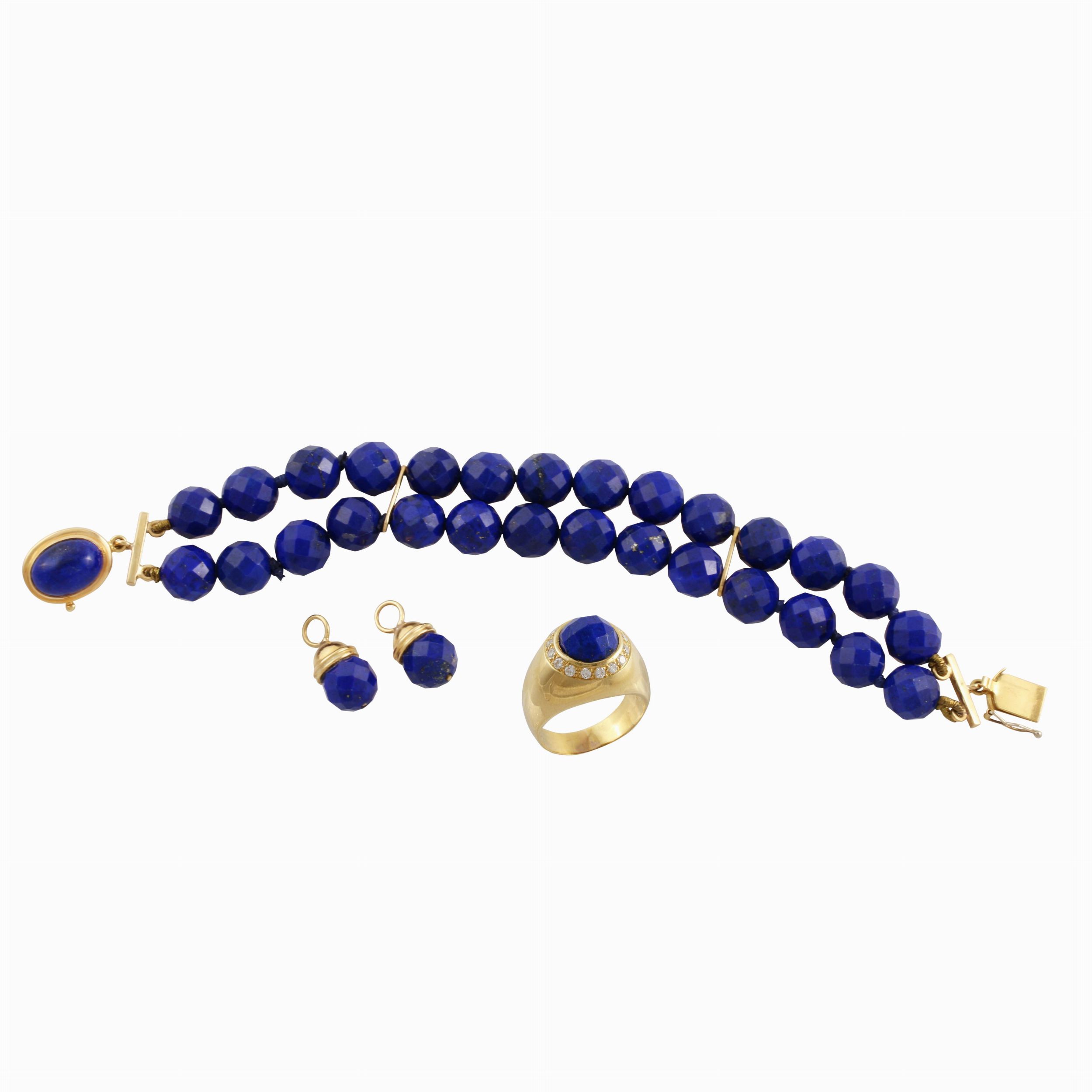 in oro giallo con lapislazzuli, composta da bracciale, anello ornato da brillanti e coppia di pendenti. Lunghezza bracciale 19 cm, misura anello 16