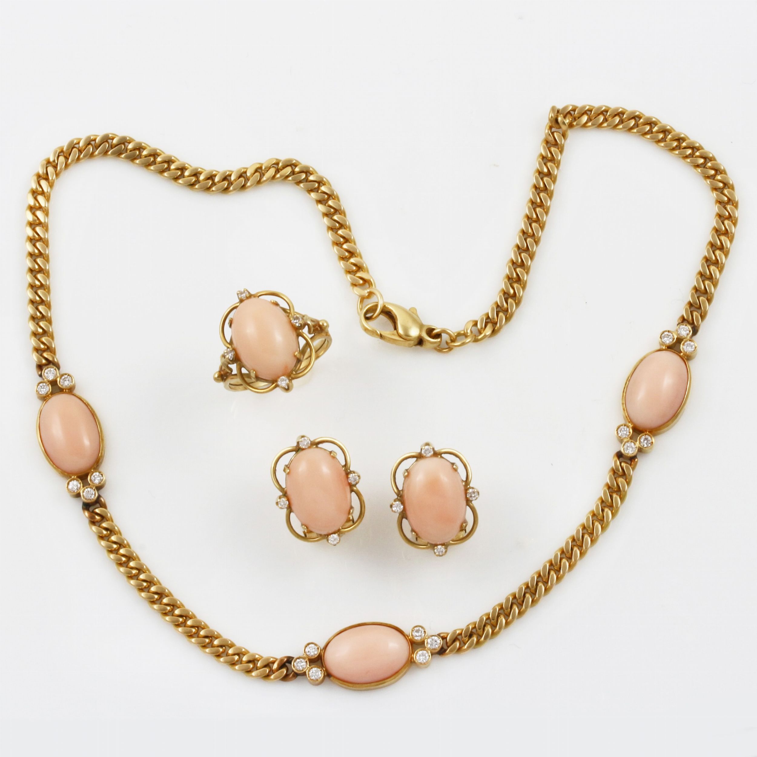 in oro giallo, coralli e brillanti, composta da girocollo a maglia groumette, anello e orecchini, gr. complessivi 45,5.Lunghezza girocollo 39 cmMisura anello 16