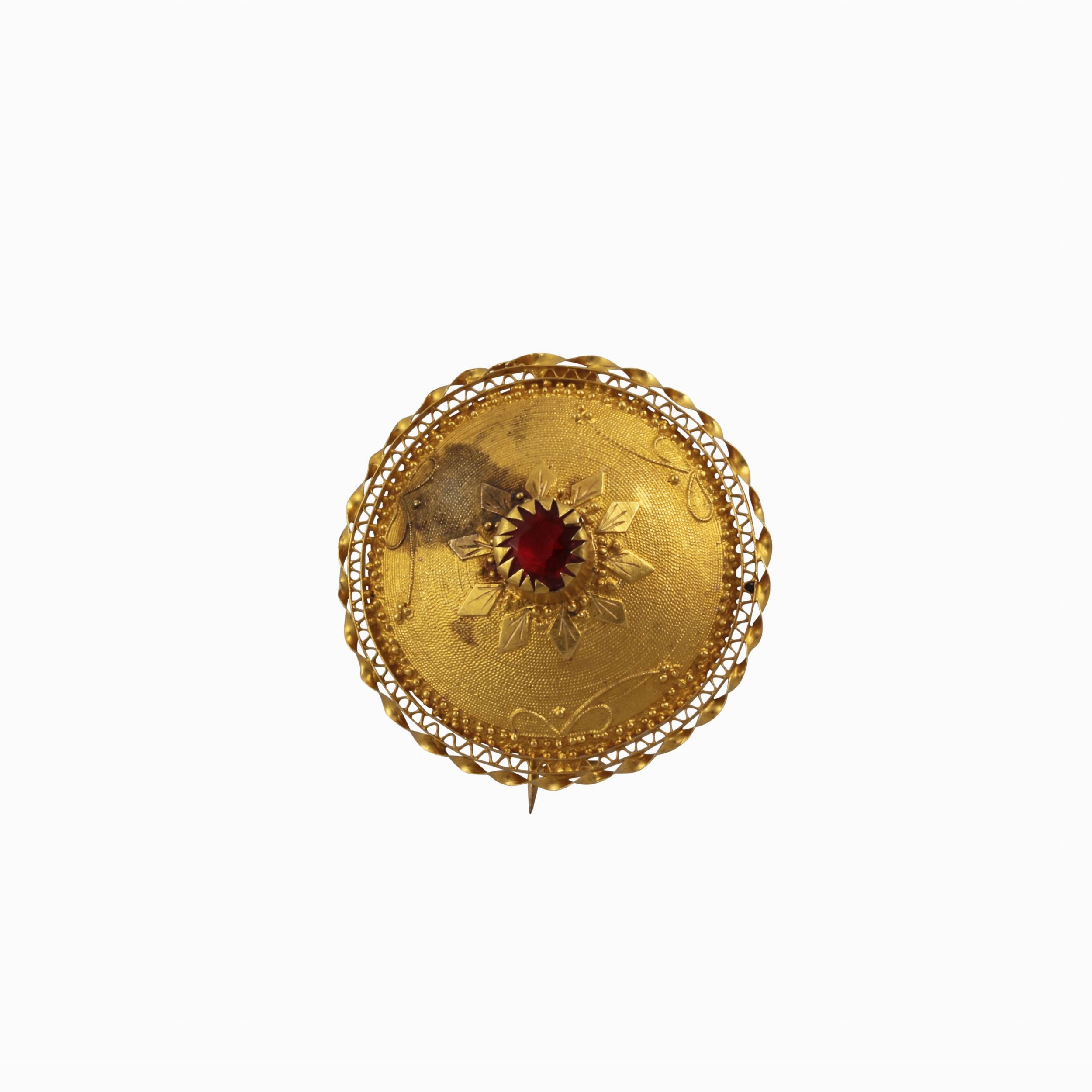a bottone in filigrana sarda d'oro giallo con pietra sintetica rossa al centro, gr. 6,5.Diametro 3,5 cm ca.
