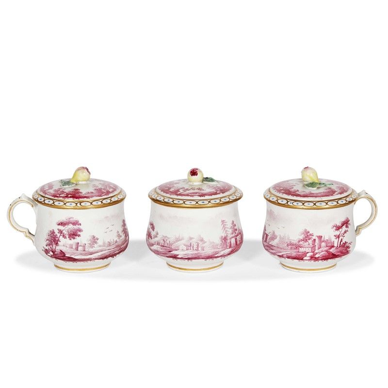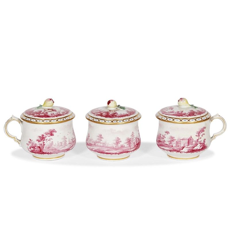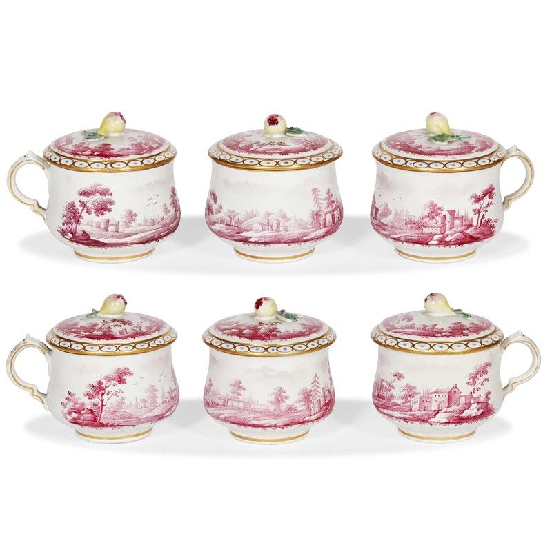 SEI CREMIERE CON COPERCHIO, DOCCIA, MANIFATTURA GINORI, FINE SECOLO XVIII in porcellana dipinta in policromia e oro, la superficie interamente decoro a monocromia porpora con paesaggi alberati. Coperchi sormontati da presa a forma di frutto policromo e bordati con il tipico decoro definito “a mezzo uovo”; alt. cm 7,5 (compreso il coperchio)