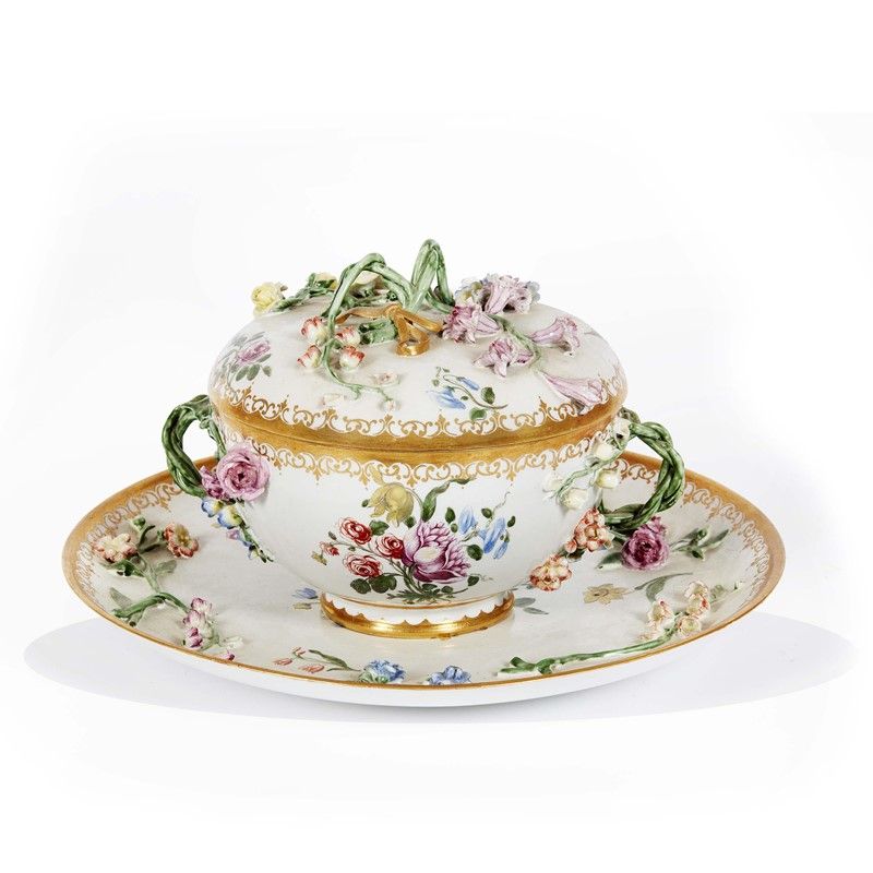 in porcellana dipinta in policromia e oro a motivi floreali. L’intera superficie è impreziosita da una ricca decorazione a rilievo composta da tralci fioriti, a loro volta dipinti in policromia, che fungono da prese per la tazza e per il manico del coperchio. Il decoro è poi completato dalla raffigurazione di due grandi mazzi di fiori al centro del piatto e sulla parete della tazza. Anche l’interno della tazza ospita un grande ramo fiorito; tazza diam. cm 14, piatto diam. cm 25,5