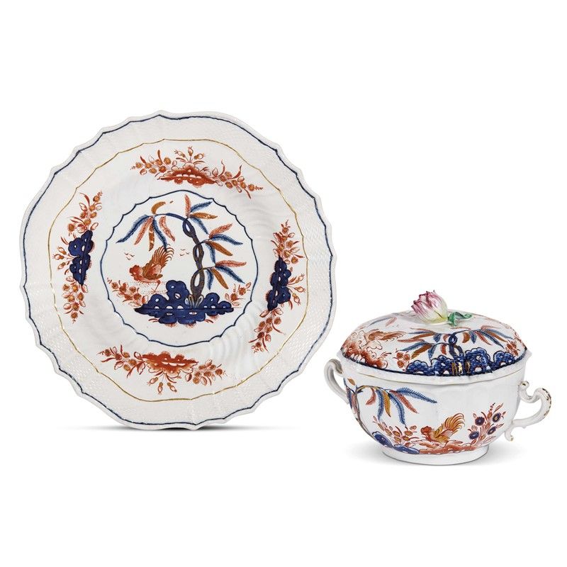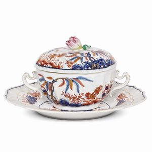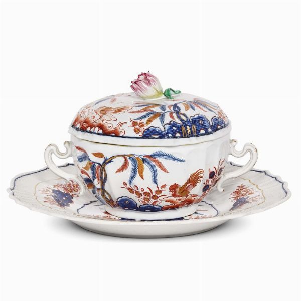 TAZZA DA BRODO CON COPERCHIO E PIATTO, DOCCIA, MANIFATTURA GINORI, 1770 CIRCA