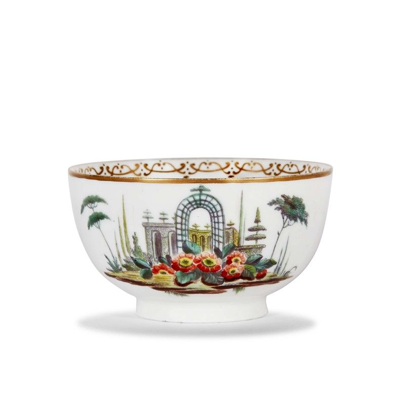 in porcellana dipinta in policromia e oro, decorata nel caratteristico motivo definito negli inventari di fabbrica a Bersò, caratterizzato dalla raffigurazione dei giardini all’italiana delle ville venete, protagonisti all’epoca della moda della villeggiatura. Tale decoro, creazione originale di Cozzi, ebbe grande successo e accompagnò tutta la vita della manifattura, e vede qui protagonista un arco che si apre su un padiglione in un giardino con fiori da ampie corolle. L’interno del bordo è impreziosito da un raffinato fregio in oro mentre al centro è dipinto un piccolo fiore policromo. Tazza a coppetta su base ad anello. Marca in rosso sul fondo; alt. cm 4,8
