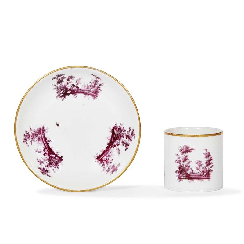 in porcellana dipinta in monocromia e oro, la superficie interamente decorata in porpora con tre piccoli paesaggi alberati disposti simmetricamente, il bordo profilato in oro. Tazza di forma cilindrica con presa ad orecchio; tazzina alt. cm 5,1, piattini diam. 11,2