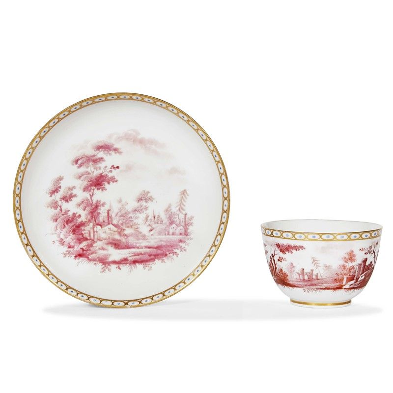 in porcellana dipinta in policromia e oro, la superficie interamente decorata a monocromia porpora con paesaggio alberato, il bordo segnato dal tipico decoro definito “a mezzo uovo”. Tazza a forma di ciotola con presa ad orecchio; tazzina alt. cm 4,8, piattino diam. 13