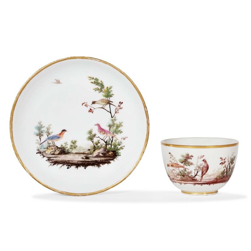 in porcellana dipinta in policromia, decorata secondo il tipico motivo denominato “a paesaggi con volatili”, a occupare la quasi totalità della superficie, mentre una ghirlanda fogliata contorna il manico. Tazza a forma di ciotola su basso piede ad anello con ansa ad orecchio; tazzina alt. cm 4,8, piattino diam. 13