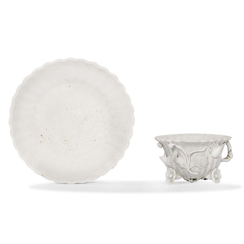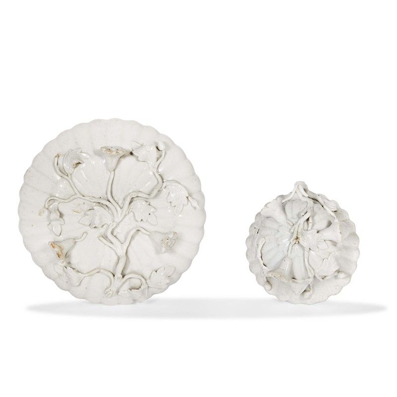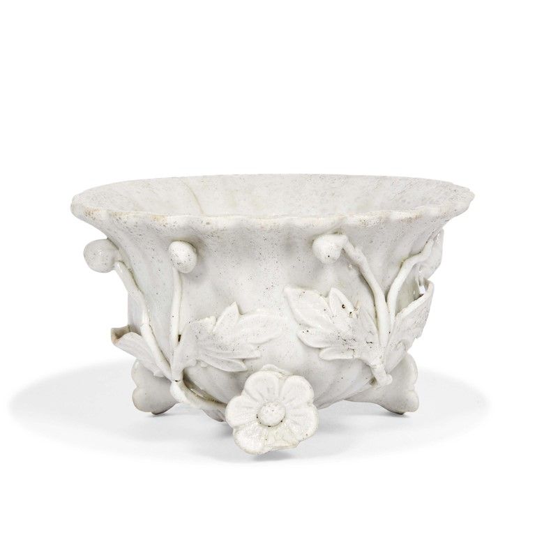 in porcellana bianca con applicazioni a rilievo. Raro per la sua tipologia, questo insieme di tazzina e piattino, modellati nel corpo con un susseguirsi di baccellature, mostrano numerose applicazioni di tralci e fiori a rilievo, che sul fondo del piattino fungono da piedini mentre sulla tazza ne costituiscono anche il manico. La decorazione e l’impasto della porcellana ci portano a proporre una datazione entro il primo periodo di attività della manifattura. Tazzina alt. cm 4,4, piattino diam. 12,3