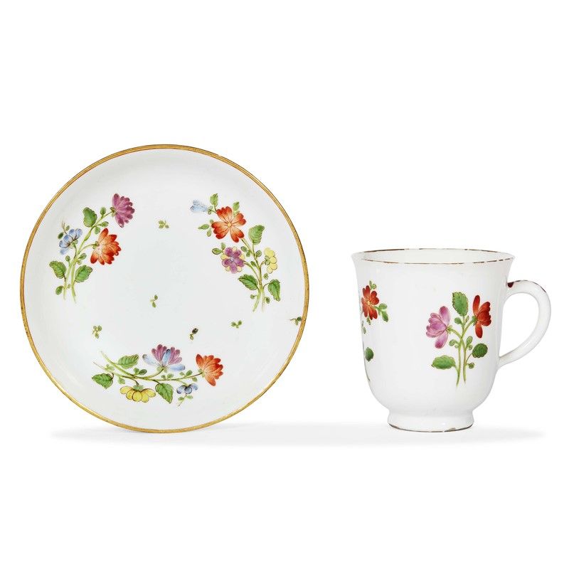TAZZINA CON PIATTINO, DOCCIA, MANIFATTURA GINORI, 1760 CIRCA in porcellana dipinta in policroma e oro, decorata con un motivo “a fiori europei” delineato con precisione e ricchezza di colori. Tazza con corpo a campana su piede ad anello e presa ad orecchio; tazzina alt. cm 7, piattino diam. 12,2