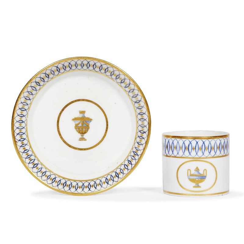 in porcellana dipinta in monocromia azzurra e oro, superficie centrata da riserva circolare con vaso ad anfora e orlo con ampia fascia con decoro geometrico. Tazza di forma cilindrica con ansa angolata; marca stella in rosso sul fondo di entrambi i pezzi e lettera F incussa nella pasta sul retro del piattino; tazzina alt. cm 5,8, piattini diam. 13,4