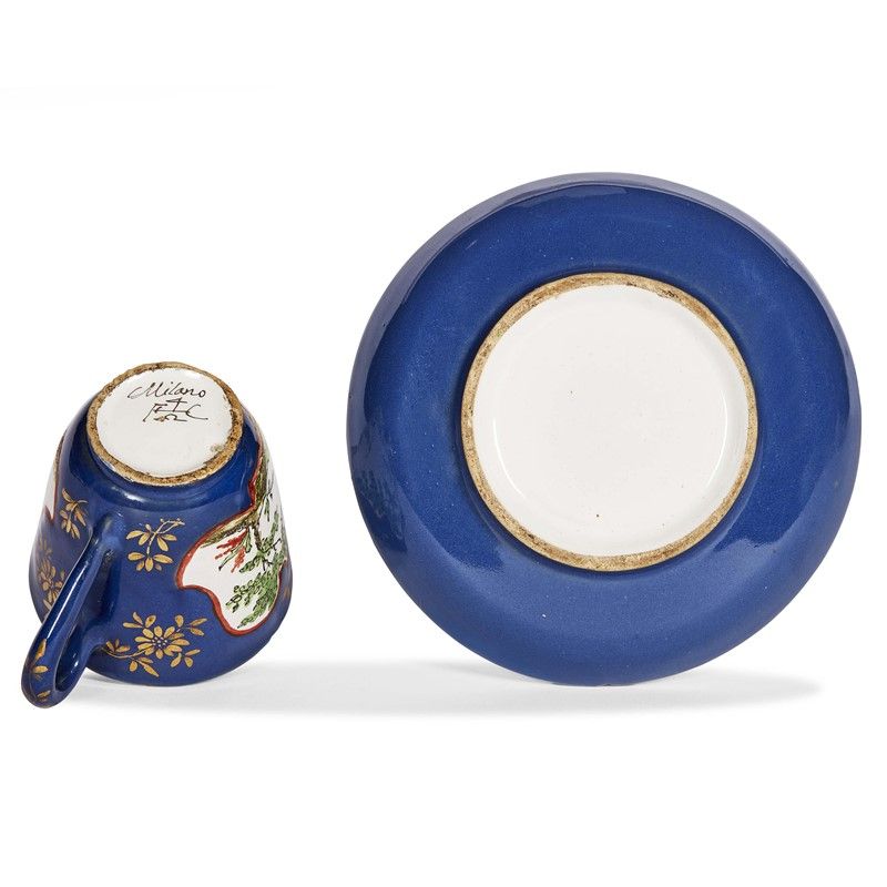in maiolica dipinta in policromia e oro su fondo blu. La decorazione, denominata “Milano blu”, prevede sul piattino una grande riserva sagomata bordata in oro, che racchiude un viandante con bastone tra due alberi con un uccello in volo, mentre sulla tazzina due analoghe riserve contrapposte, bordate in rosso, ciascuna con una figura entro paesaggio; il fondo blu è invece impreziosito da decori vegetali in oro. La decorazione è nota negli inventari della manifattura Clerici come “paesini a smalto a comparto blu con oro”, e numerosi sono i pezzi di confronto firmati, come le due tazze conservate al Castello Sforzesco di Milano con caratteristiche molto simili. Tazza a forma di campana su piede ad anello leggermente svasato, priva di presa. Marca Milano FC a frazione in nero sul fondo della tazzina; tazzina alt. cm 6,8, piattino diam. cm 13,4