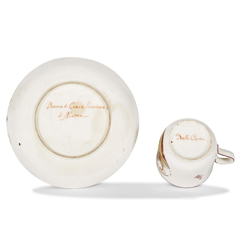 in porcellana dipinta in policromia, decorata con “costumi del Regno” in una versione più corriva. Nel piattino una popolana, descritta in rosso nel cartiglio come “donna di Craco”, compare in varie versioni nelle più accurate porcellane della Real Fabbrica, mentre sulla tazza un’altra scena spesso rappresentata, la “donna di Cupa”. Marca N coronata incussa nella pasta e iscrizione Della Cupa in rosso sul fondo della tazzina; iscrizione Donna di Craco, Provinca/ di Matera in rosso sul retro del piattino; tazzina alt. cm 6, piattino diam. 13,2