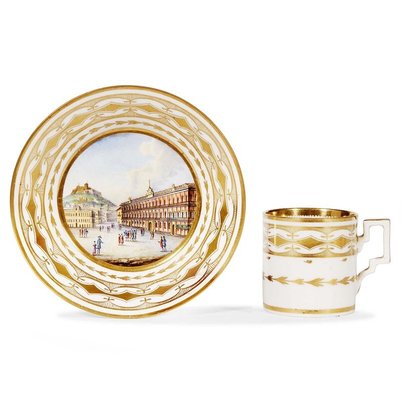 in porcellana policroma decoro “con vedute”. La tazzina reca al centro la veduta del Palazzo Reale, come ben si evince dalla legenda sul retro del piattino, ma anche dai confronti con opere coeve, come ad esempio un grande vaso ad anfora pubblicato e che reca, così come una tazzina coerente per forma e stile decorativo, ma con veduta della darsena, la stessa marca. Marca N corona chiusa in blu sul fondo della tazzina; iscrizione Real Palazzo di Napoli in rosso e numero 8 incusso nella pasta sul retro del piattino; tazzina alt. cm 5,8, piattino diam. 14