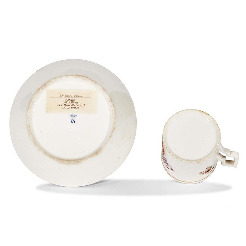 in porcellana policroma con decoro “a bouquet”. La tazza e il piattino recano entrambe un decoro floreale con roselline e fiori di campo, dipinti con grande freschezza. Opere simili appartengono al periodo della gestione Poulard Prad attorno al 1810-1818, tra le quali possimo segnalare un bouquet simile nella salsiera e piatto del Museo di Capodimonte, impreziosito però da una fascia arancio. La tazza cilindrica e il piattino rotondo con tesa rilevata hanno piede appena concavo. Marca N coronata in blu ed etichetta di provenienza S. Giusti / U. Podestà - Milano sul retro del piattino; tazzina alt. cm 6, piattino diam. 13