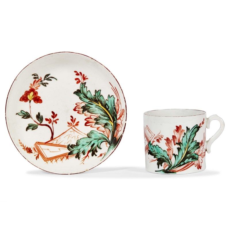 in porcellana dipinta in policromia, secondo un’interpretazione inusuale della “foglia di tabacco” in uso in molte manifatture europee. Tazza di forma cilindrica con ansa a ricciolo; tazzina alt. cm 5,5, piattino diam. cm 11,4