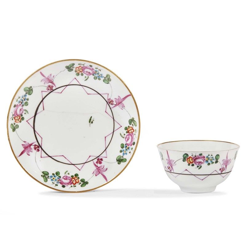 in porcellana dipinta in policromia e oro. Il decoro prevede un motivo principale con festoni floreali alternati a foglie dipinte in porpora, accompagnato da un motivo a linea spezzata incrociato con una linea circolare. Tazza a coppetta su piede ad anello. Etichetta di provenienza D. Piva/U. Podestà – Milano sul retro del piattino; tazza alt. cm 4,2, piattino diam. cm 11,8