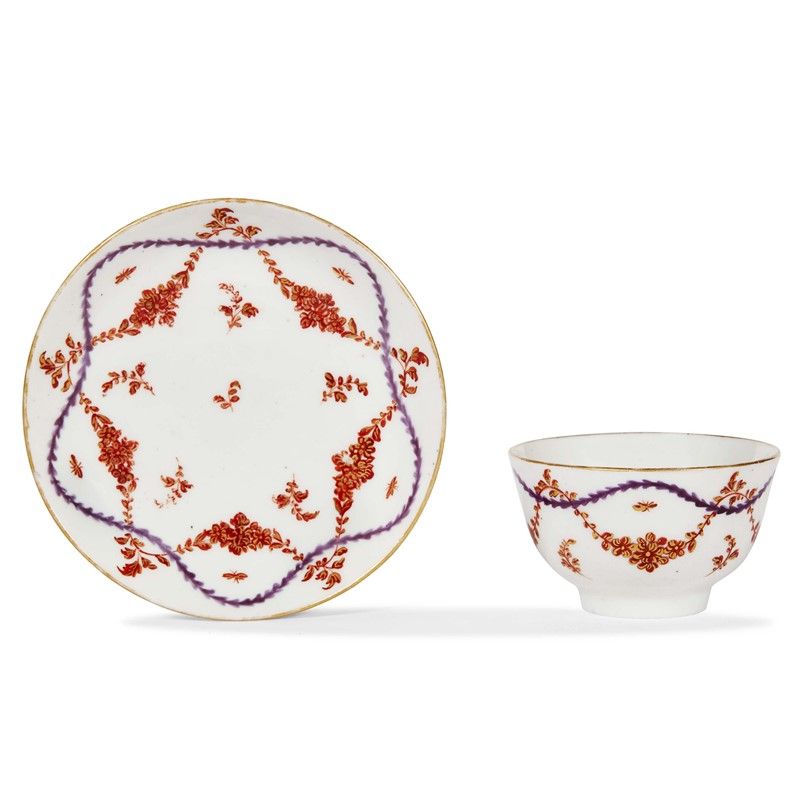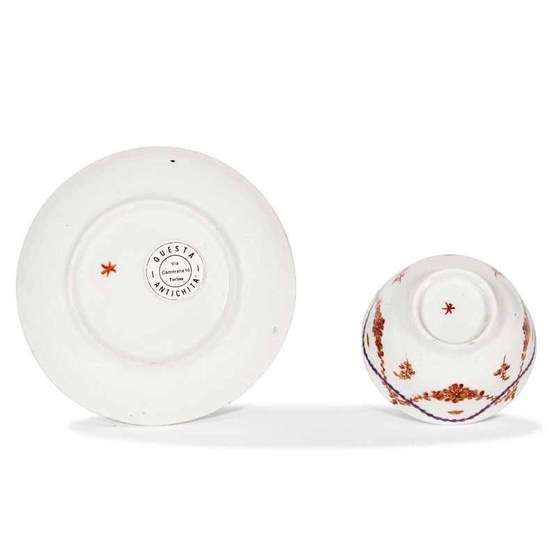 in porcellana dipinta in policromia e oro. Il decoro prevede un motivo ornamentale ottenuto dall’incrocio di sottili ghirlande fiorite dipinte in rosso e oro e di un filo fogliato in porpora. Tazza a coppetta su piede ad anello. Marca asterisco in rosso sul fondo di entrambi i pezzi ed etichetta di provenienza QUESTA ANTICHITÀ – TORINO sul retro del piattino; tazza alt. cm 4,2, piattino diam. cm 11,2