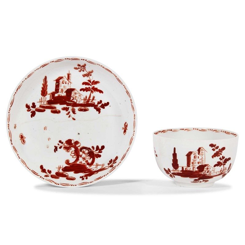 in porcellana dipinta in monocromia rosso ferro. Il decoro è composto da due motivi diversi: un piccolo paesaggio con casali e alberelli e un ornamento a griglia tra motivi rocaille con piccoli steli fogliati. All’interno della tazzina è dipinto un grande fiore. Tazza a coppetta su piede ad anello. Etichetta di provenienza