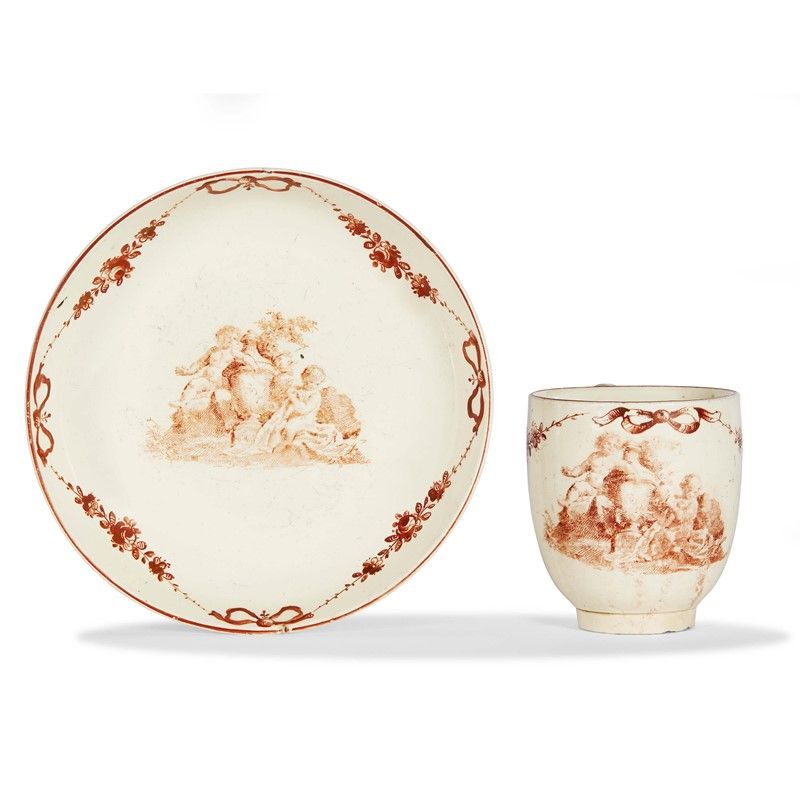 in maiolica dipinta in monocromia rosso ferro su uno smalto color crema con scenette con putti in paesaggi arcadici circondati da sottili ghirlande fiorite. Il decoro monocromo, solitamente in porpora, era riservato da Boselli a opere di forme particolari o a opere maggiori. La tazzina doveva appartenere a un servizio particolare vista la scelta cromatica. La tazza ha forma a campana con ansa doppia disposta incrociata e terminante con elementi fogliati a rilievo, il piattino rotondo ha la tesa appena rilevata, entrambe poggianti su piede ad anello. Firma Jacques Boselly in bruno su entrambe i pezzi; tazzina alt. cm 6,7, piattino diam. cm 13,1