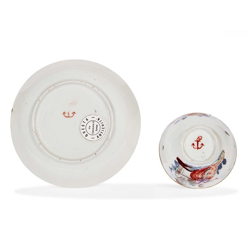 in porcellana dipinta in policromia e oro, decorata con scene raffiguranti dame “alla Wateau” e nella tazzina un caramogio in veste di statua da giardino, in paesaggi con architetture tra mazzetti di fiori. All’interno della tazzina è dipinta una composizione floreale. Tazza a campana su base ad anello. Marca in rosso su entrambi i pezzi ed etichetta di provenienza QUESTA ANTICHITÀ – TORINO sul retro del piattino; tazzina alt. cm 3,9, piattino diam. cm 11,5