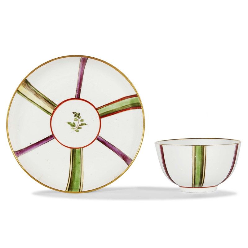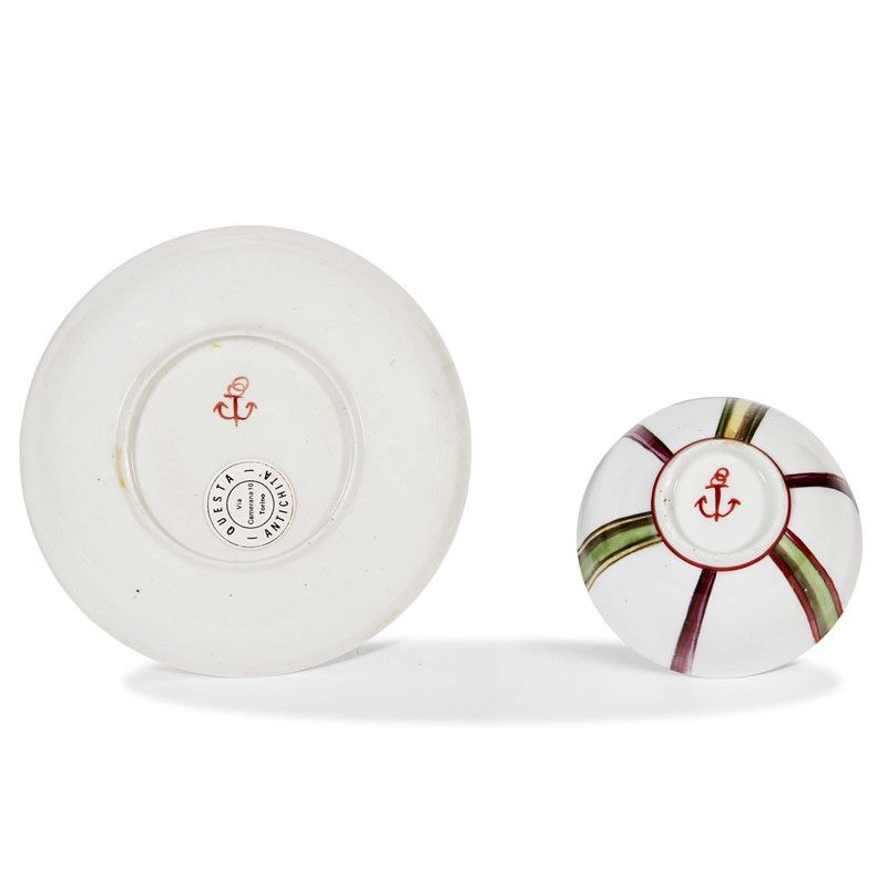 in porcellana dipinta in policromia e oro, decorata nel caratteristico motivo definito negli inventari di fabbrica a striche, caratterizzato da un decoro a fasce radiali in diverse tonalità sfumate. All’interno della tazzina è dipinto un ramo fogliato. Tazza a coppetta su base ad anello. Marca in rosso sul fondo di entrambi i pezzi; sul retro del piattino etichetta di provenienza QUESTA ANTICHITÀ – TORINO. Tazzina alt. cm 4,4, piattino diam. cm 12,4