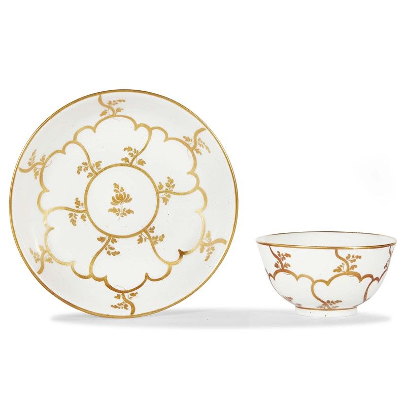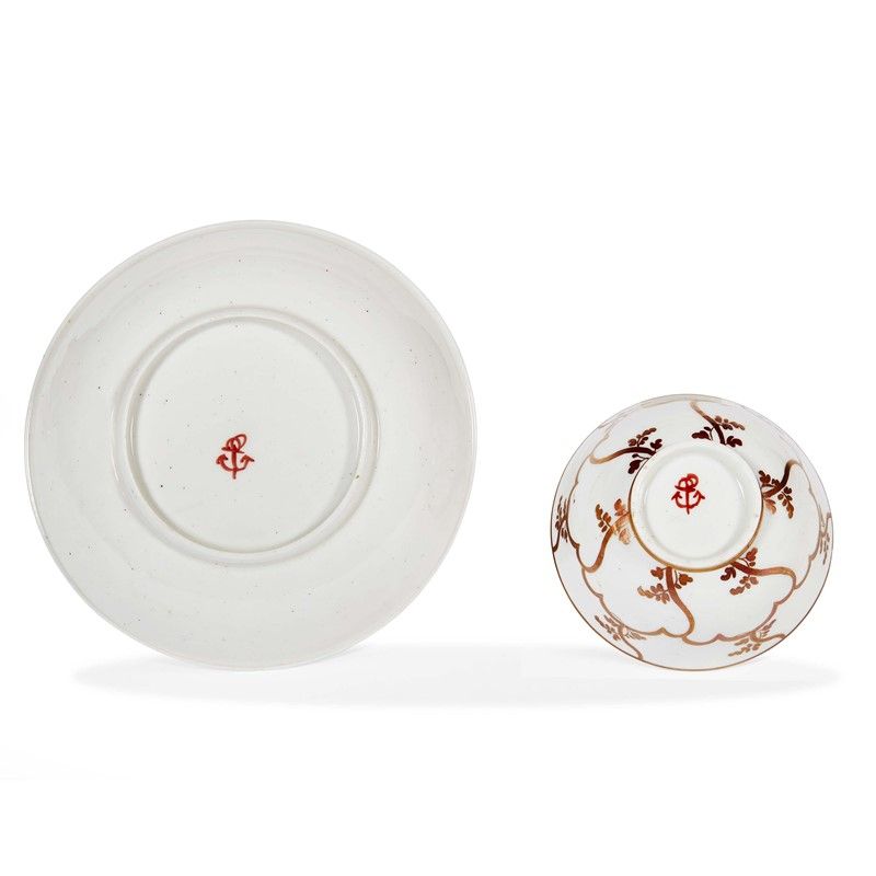 in porcellana dipinta in oro zecchino, decorata nel caratteristico motivo definito negli inventari di fabbrica a feston e cadena, di ispirazione orientale, dove però la catena non è mai accompagnata ai ramoscelli fioriti. Tale ornato è conferma una volta di più l’abilità dei pittori della manifattura, espressa qui attraverso l’esecuzione di un decoro semplice e veloce, ottenuto con costi di produzione poco elevati, e tuttavia estremamente delicato ed elegante. All’interno della tazzina è dipinto un fiore in oro. Tazza a coppetta su base ad anello. Marca in rosso sul fondo di entrambi i pezzi; tazzina alt. cm 4, piattino diam. cm 11,7