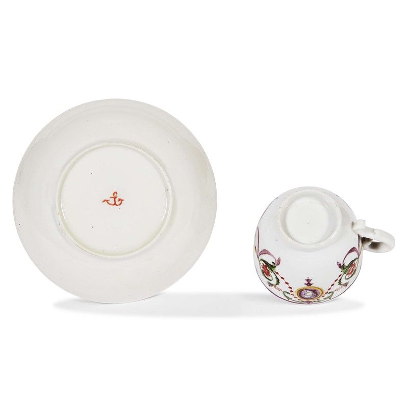 in porcellana dipinta in policromia, decorata nel caratteristico motivo definito negli inventari di fabbrica a medaglie, caratterizzato da un nastro e da un festone intrecciato ad una ghirlanda di foglie, dai quali pendono cammei con volti maschili. Tazza a campana su base ad anello con presa sagomata sormontata da bottone. Marca in rosso sul fondo del piattino; tazzina alt. cm 5,7, piattino diam. cm 11,7